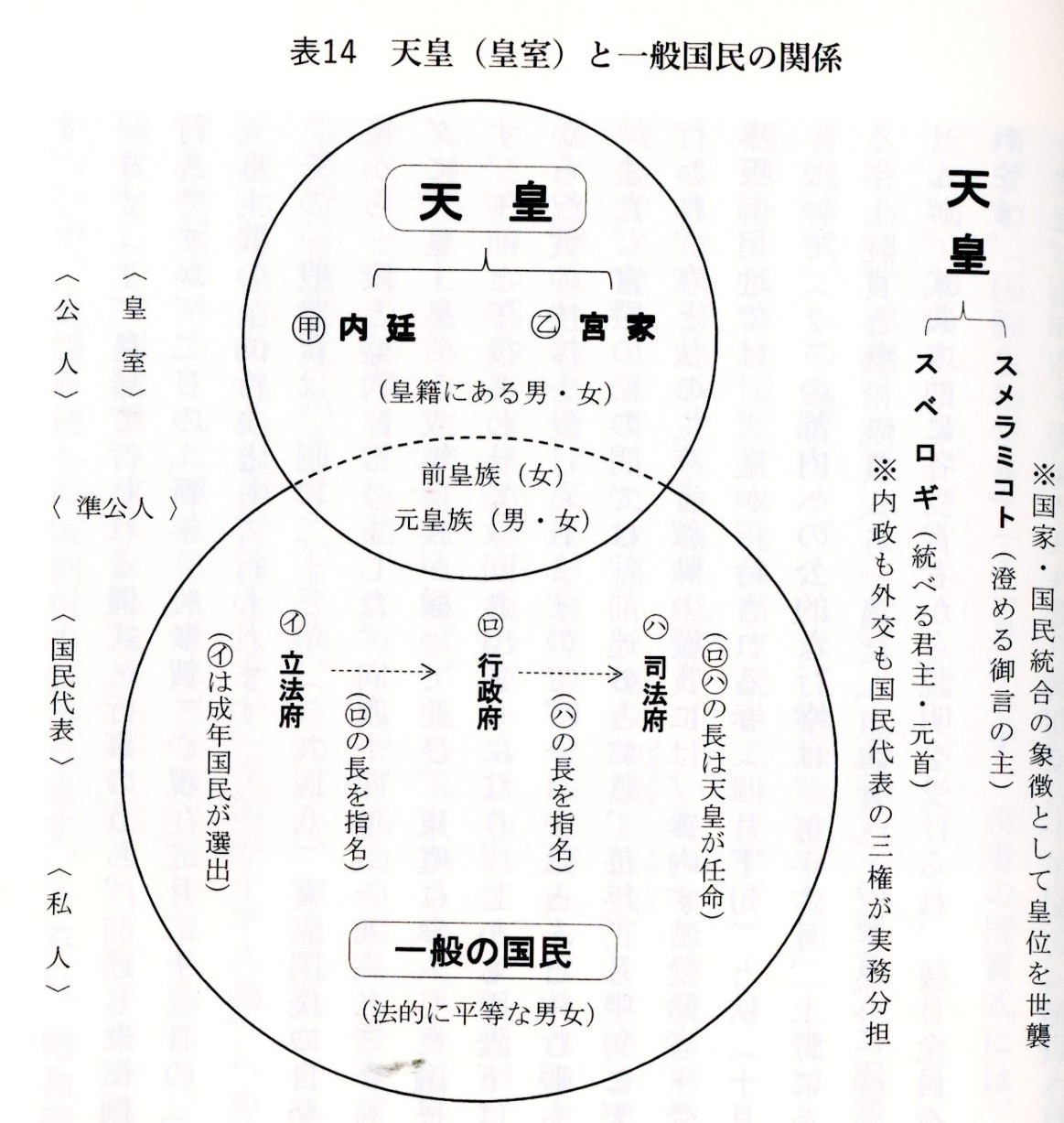 B ついで「皇族」は、大別して二種類の重要な役割がある。その一つは㋩皇統に属する皇族として皇位を継承し天皇の大任を担い果たされることである。もう一つは㋥皇族として品位を持ちながら天皇を支え助けると共に公務を分担することである。このうち、現在㋩に関しては、「男系の男子」に限られ、結婚により皇室に入る后妃だけでなく、皇室において生まれ育った皇族女子も資格を認められていない。